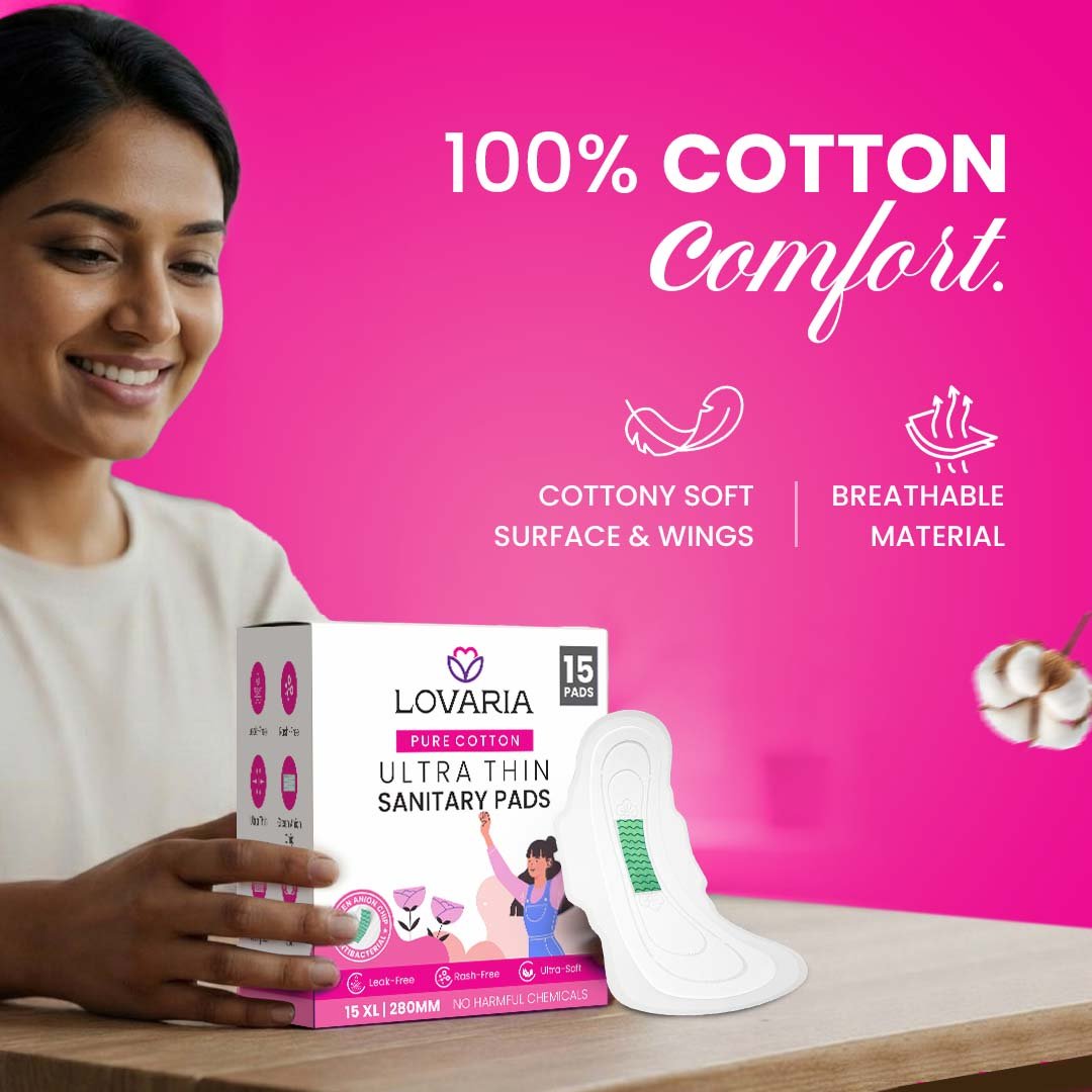 Lovaria Ultra-Thin Cotton Sanitary Pads for Women | XL Pads | Rash Free Period | Toxin-Free, No Chemicals, Leak-Proof Protection | Super Absorbent Meadium | Combo of 3 Packet (Total 45 Pads)